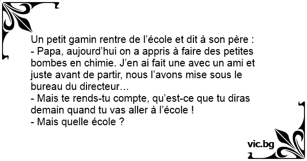 - Papa, aujourd’hui on a appris à faire des petites bombes en chimie. J’en ai fait une avec un ami et juste avant de partir, nous l’avons mise sous le bureau du directeur…
