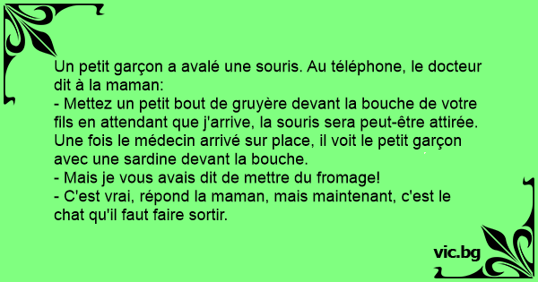 Un petit garçon a avalé une souris. Au téléphone, le docteur dit à la maman: