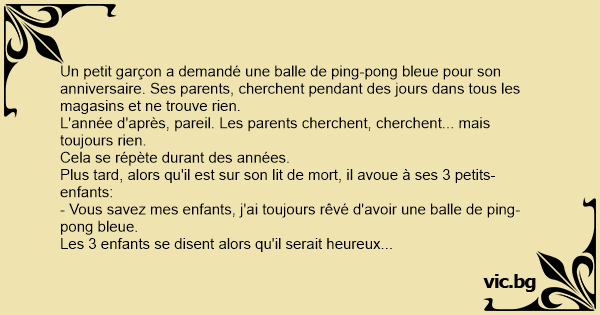 Un petit garçon a demandé une ваllе de ping-pong bleue pour son anniversaire. Ses parents, cherchent pendant des jours dans tous les magasins et ne trouve rien.