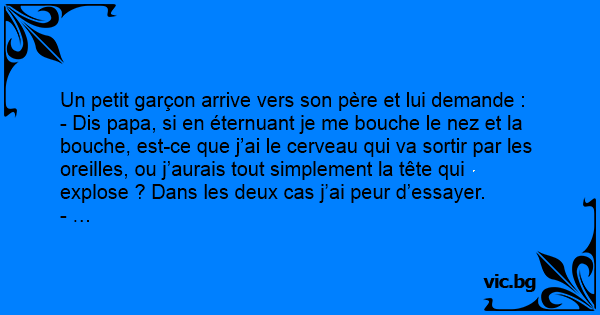 - Dis papa, si en éternuant je me bouche le nez et la bouche, est-ce que j’ai le cerveau qui va sortir par les oreilles, ou j’aurais tout simplement la tête qui explose ? Dans les deux cas j’ai peur d’essayer.