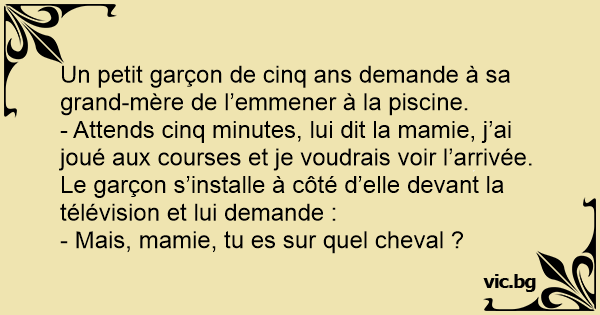 - Attends cinq minutes, lui dit la mamie, j’ai joué aux courses et je voudrais voir l’arrivée.