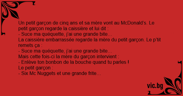 Un petit garçon de cinq ans et sa mère vont au McDonald’s. Le petit garçon regarde la caissière et lui dit :