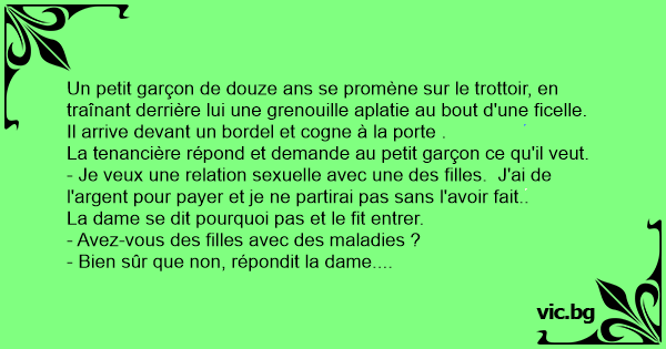 Un petit garçon de douze ans se promène sur le trottoir, en traînant derrière lui une grenouille aplatie au bout d'une ficelle. Il arrive devant un bordel et cogne à la porte .