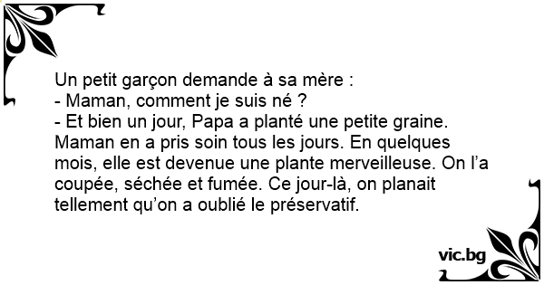 - Et bien un jour, Papa a planté une petite graine. Maman en a pris soin tous les jours. En quelques mois, elle est devenue une plante merveilleuse. On l’a coupée, séchée et fumée. Ce jour-là, on planait tellement qu’on a oublié le préservatif.