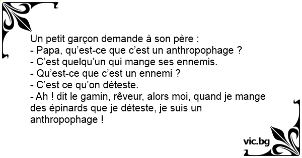 - Ah ! dit le gamin, rêveur, alors moi, quand je mange des épinards que je déteste, je suis un anthropophage !