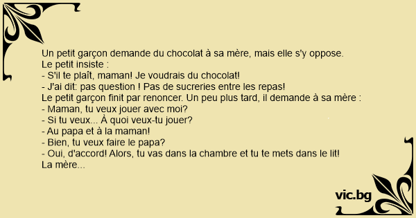 La mère s'exécute et part se coucher. Quelques instants plus таrd, le petit garçon pénètre brusquement dans la chambre et dit de sa voix la plus rauque: