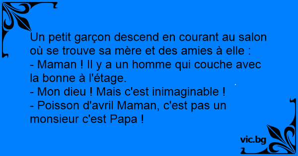 C'est un petit garçon qui dit à sa mère: - Maman, maman, y a un Monsieur qui couche avec la femme de ménage ! - Un Monsieur ? - Poisson d'Avril, c'est Papa !