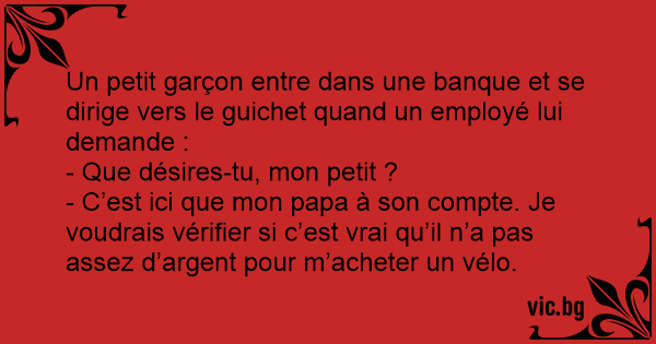 Un petit garçon entre dans une banque et se dirige vers le guichet quand un employé lui demande :