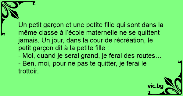 Un petit garçon et une petite fille qui sont dans la même classe à l’école maternelle ne se quittent jamais. Un jour, dans la cour de récréation, le petit garçon dit à la petite fille :