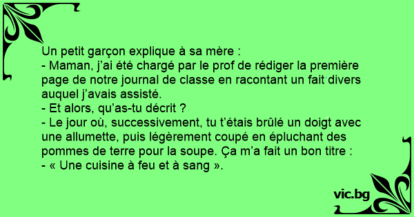 - Maman, j’ai été chargé par le prof de rédiger la première page de notre journal de classe en racontant un fait divers auquel j’avais assisté.