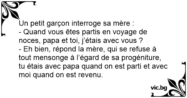 - Eh bien, répond la mère, qui se refuse à tout mensonge à l’égard de sa progéniture, tu étais avec papa quand on est parti et avec moi quand on est revenu.