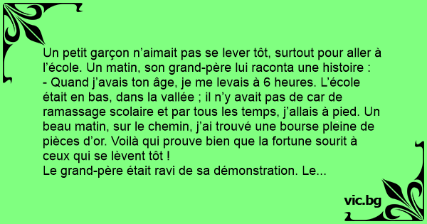 - Quand j’avais ton âge, je me levais à 6 heures. L’école était en bas, dans la vallée ; il n’y avait pas de car de ramassage scolaire et par tous les temps, j’allais à pied. Un beau matin, sur le chemin, j’ai trouvé une bourse pleine de pièces d’or. Voilà qui prouve bien que la fortune sourit à ceux qui se lèvent tôt !