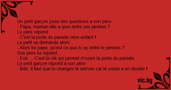 Un jour, Marc demande à son papa : - Papa c'est quoi entre le jambe de maman ? - C'est la porte du paradis ! - Et entre tes jambes c'est quoi ? - C'est la clé qui ouvre la porte du paradis ! - Et...
