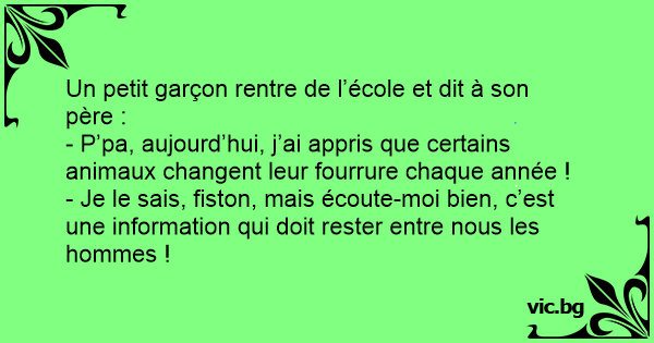 - Je le sais, fiston, mais écoute-moi bien, c’est une information qui doit rester entre nous les hommes !