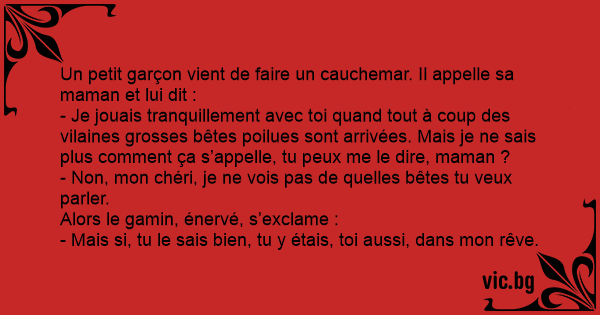 Un petit garçon vient de faire un cauchemar. Il appelle sa maman et lui dit :