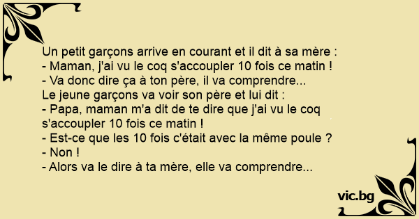 - Papa, maman m'a dit de te dire que j'ai vu le coq s'accoupler 10 fois ce matin !