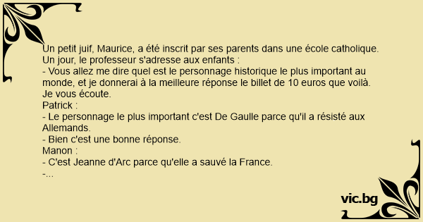 Un petit juif, Maurice, a été inscrit par ses parents dans une école catholique. Un jour, le professeur s'adresse aux enfants :