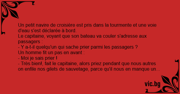 - Très bien!, fait le capitaine, alors priez pendant que nous autres on enfile nos gilets de sauvetage, parce qu'il nous en manque un...