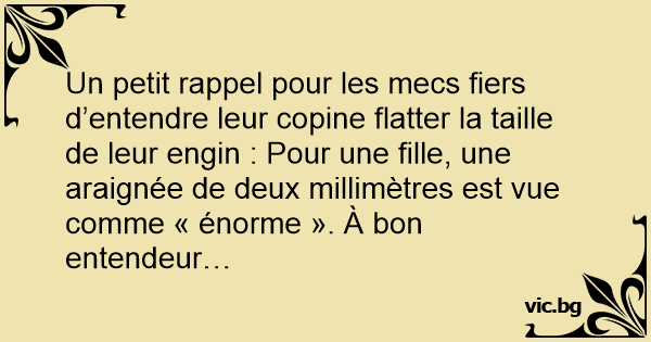 Un petit rappel pour les mecs fiers d’entendre leur copine flatter la taille de leur engin : Pour une fille, une araignée de deux millimètres est vue comme « énorme ». À bon entendeur…