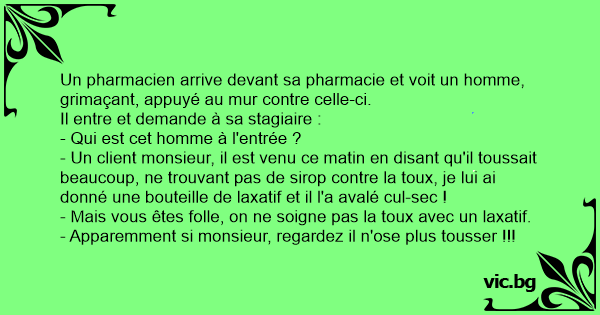 - Un client monsieur, il est venu ce matin en disant qu'il toussait beaucoup, ne trouvant pas de sirop contre la toux, je lui ai donné une bouteille de laxatif et il l'a avalé cul-sec !
