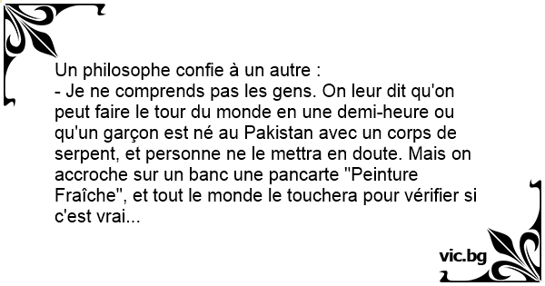 - Je ne comprends pas les gens. On leur dit qu'on peut faire le tour du monde en une demi-heure ou qu'un garçon est né au Pakistan avec un corps de serpent, et personne ne le mettra en doute. Mais on accroche sur un banc une pancarte "Peinture Fraîche", et tout le monde le touchera pour vérifier si c'est vrai...