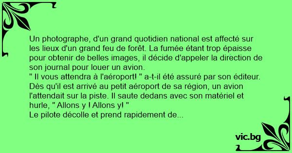 Un photographe, d'un grand quotidien national est affecté sur les lieux d'un grand feu de forêt. La fumée étant trop épaisse pour obtenir de belles images, il décide d'appeler la direction de son journal pour louer un avion.