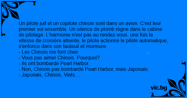 Un pilote juif et un copilote chinois sont dans un avion. C'est leur premier vol ensemble. Un silence de plomb règne dans le cabine de pilotage. L'harmonie n'est pas au rendez-vous. une fois la vitesse de croisière atteinte, le pilote actionne le pilote automatique, s'enfonce dans son fauteuil et murmure: