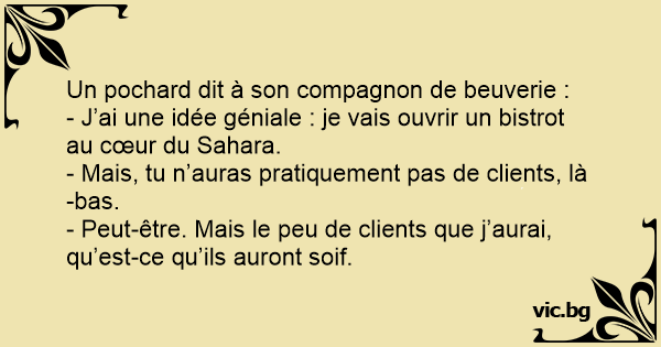 - J’ai une idée géniale : je vais ouvrir un bistrot au cœur du Sahara.