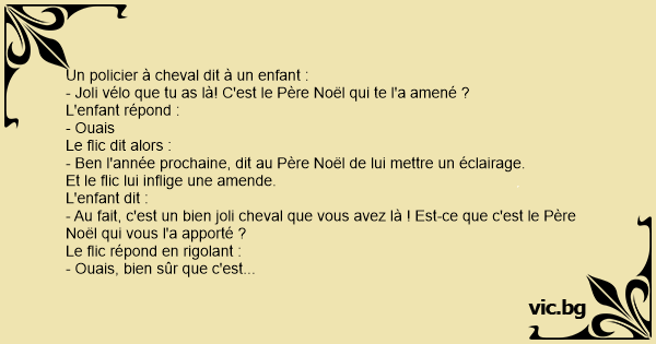 C'est un petit garçon qui sort du dépanneur et embarque sur son vélo. Une police à cheval arrive et lui dit: - Oh! Y'é donc ben beau ton vélo! - Merci! répond le petit garçon. - C'est-tu le père...
