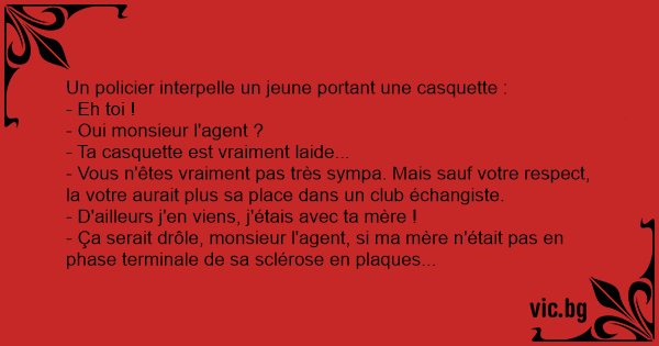 - Ça serait drôle, monsieur l'agent, si ma mère n'était pas en phase terminale de sa sclérose en plaques...