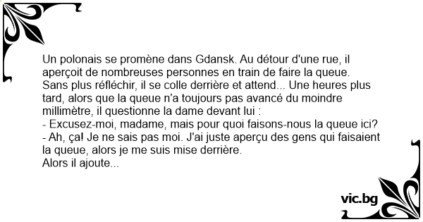 Un polonais se promène dans Gdansk. Au détour d'une rue, il aperçoit de nombreuses personnes en train de faire la queue.