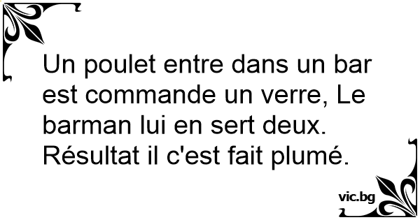 Un poulet entre dans un bar est commande un verre, Le barman lui en sert deux. Résultat il c'est fait plumé.