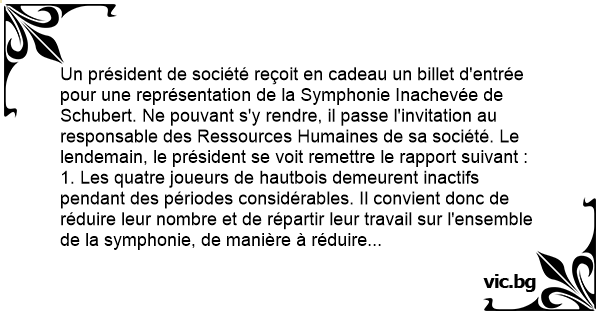 Un président de société reçoit en cadeau un billet d'entrée pour une représentation de la Symphonie Inachevée de Schubert. Ne pouvant s'y rendre, il passe l'invitation au responsable des Ressources Humaines de sa société. Le lendemain, le président se voit remettre le rapport suivant :