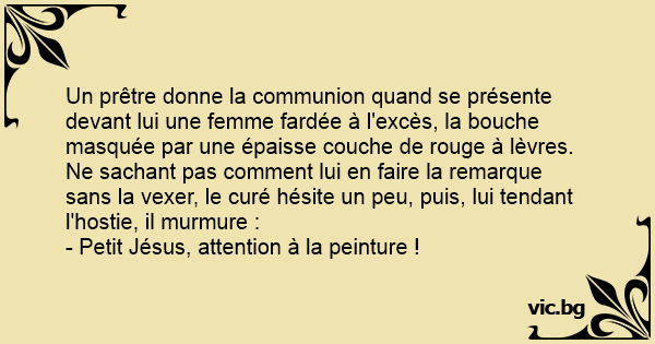 Ne sachant pas comment lui en faire la remarque sans la vexer, le curé hésite un peu, puis, lui tendant l'hоsтiе, il murmure :