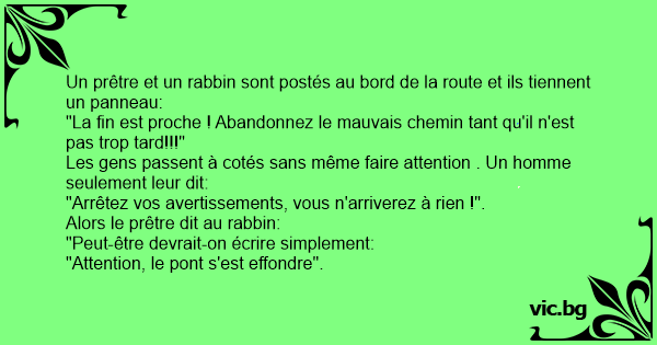 Un prêtre et un rabbin sont postés au bord de la route et ils tiennent un panneau: