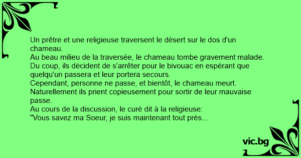 O calugarita si un preot traversau Sahara pe o camila. In cea de-a treia zi , camila moare fara avertisment. Dupa ce se sterg de praf, calugarita si preotul chestioneaza situatia . Dupa o lunga...
