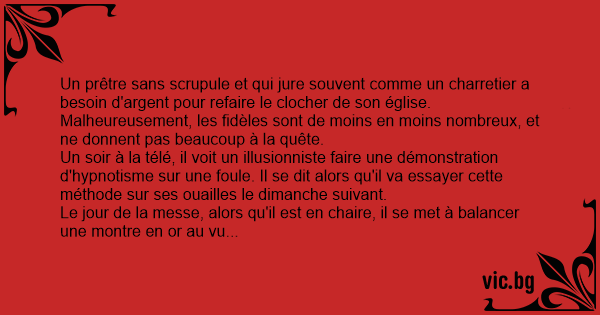 Le dimanche d'après, le curé est en chaire et balance sa montre pour endormir son public en se demandant qu'est-ce qu'il va bien pouvoir demander cette fois... lorsque, distrait par la cupidité, il laisse tomber sa montre et lâche un "Chier!"