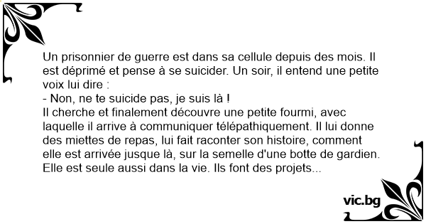 Un prisonnier de guerre est dans sa cellule depuis des mois. Il est déprimé et pense à se suicider. Un soir, il entend une petite voix lui dire :