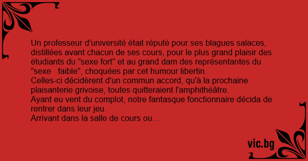 Un professeur d'université était réputé pour ses blagues salaces, distillées avant chacun de ses cours, pour le plus grand plaisir des étudiants du "sexe fort" et au grand dam des représentantes du "sexe faible", choquées par cet humour libertin.