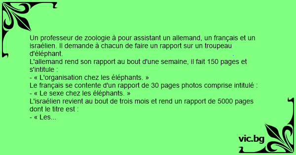 Un professeur de zoologie à pour assistant un allemand, un français et un israélien. Il demande à chacun de faire un rapport sur un troupeau d'éléphant.
