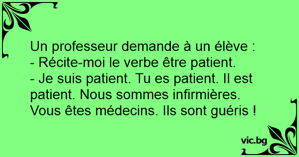 - Je suis patient. Tu es patient. Il est patient. Nous sommes infirmières. Vous êtes médecins. Ils sont guéris !