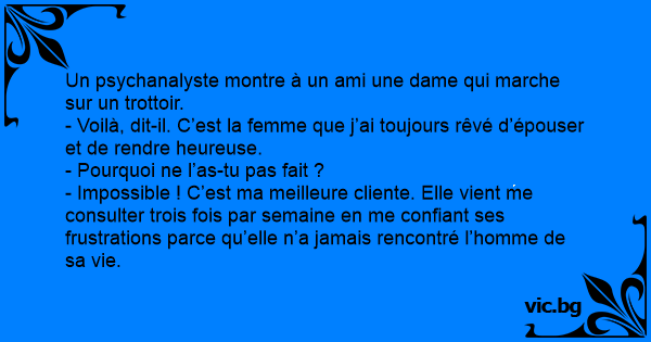 - Impossible ! C’est ma meilleure cliente. Elle vient me consulter trois fois par semaine en me confiant ses frustrations parce qu’elle n’a jamais rencontré l’homme de sa vie.