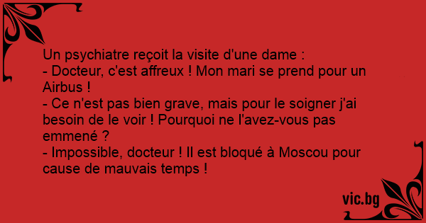 - Docteur, c'est affreux ! Mon mari se prend pour un Airbus !