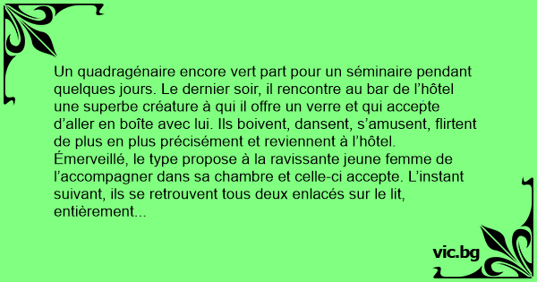 Un quadragénaire encore vert part pour un séminaire pendant quelques jours. Le dernier soir, il rencontre au bar de l’hôtel une superbe créature à qui il offre un verre et qui accepte d’aller en boîte avec lui. Ils boivent, dansent, s’amusent, flirtent de plus en plus précisément et reviennent à l’hôtel.