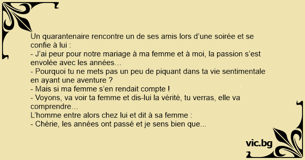 - Chérie, les années ont passé et je sens bien que nous ne sommes plus aussi proche l’un de l’autre qu’auparavant. J’aimerai retrouver notre complicité d’antan… Je me demande si cela ne resserrerait pas les liens entre nous si j’avais une aventure…