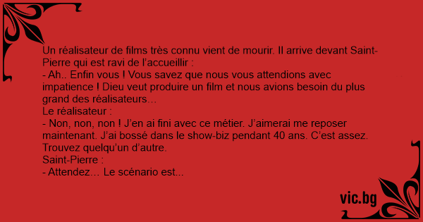 Un réalisateur de films très connu vient de mourir. Il arrive devant Sаinт-Pierre qui est ravi de l’accueillir :