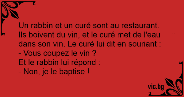 Un rabbin et un curé sont au restaurant. Ils boivent du vin, et le curé met de l'eau dans son vin. Le curé lui dit en souriant :