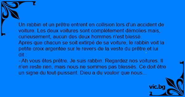 - Ah vous êtes prêtre. Je suis rabbin. Regardez nos voitures. Il n'en reste rien, mais nous ne sommes pas blessés. Ce doit être un signe du tout-puissant. Dieu a du vouloir que nous nous rencontrions, devenions amis et vivions en paix pour le reste de nos jours.