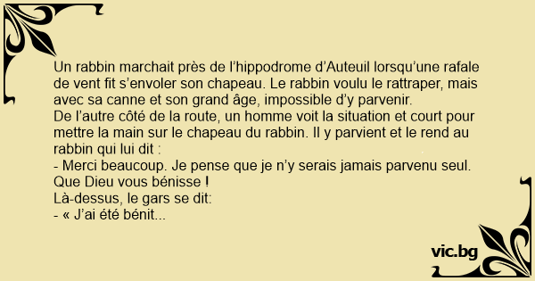 Un rabbin marchait près de l’hippodrome d’Auteuil lorsqu’une rafale de vent fit s’envoler son chapeau. Le rabbin voulu le rattraper, mais avec sa canne et son grand âge, impossible d’y parvenir.