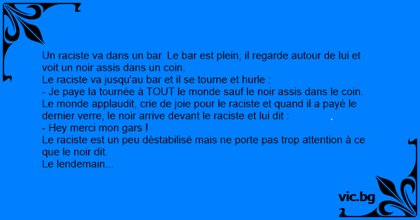 Le lendemain soir, le même raciste se pointe dans le même bar, et il voit encore le même noir assis dans son coin. Le raciste va jusqu'au bar, se retourne et crie :